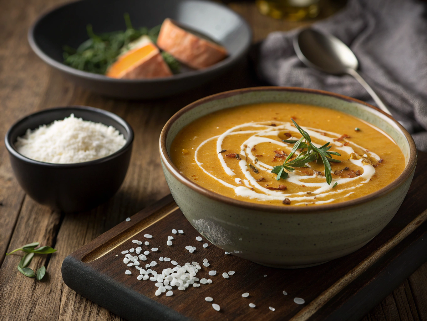 Una crema vibrante y profundamente reconfortante que transforma la calabaza asada en una seda aromática. La calidez del jengibre y la riqueza de la leche de coco crean un equilibrio perfecto para una comida nutritiva.