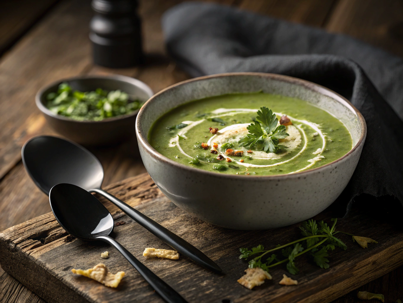 Una crema vibrante y reconfortante que equilibra el sabor terroso de la espinaca con la calidez del jengibre y la cremosidad de la leche de coco.