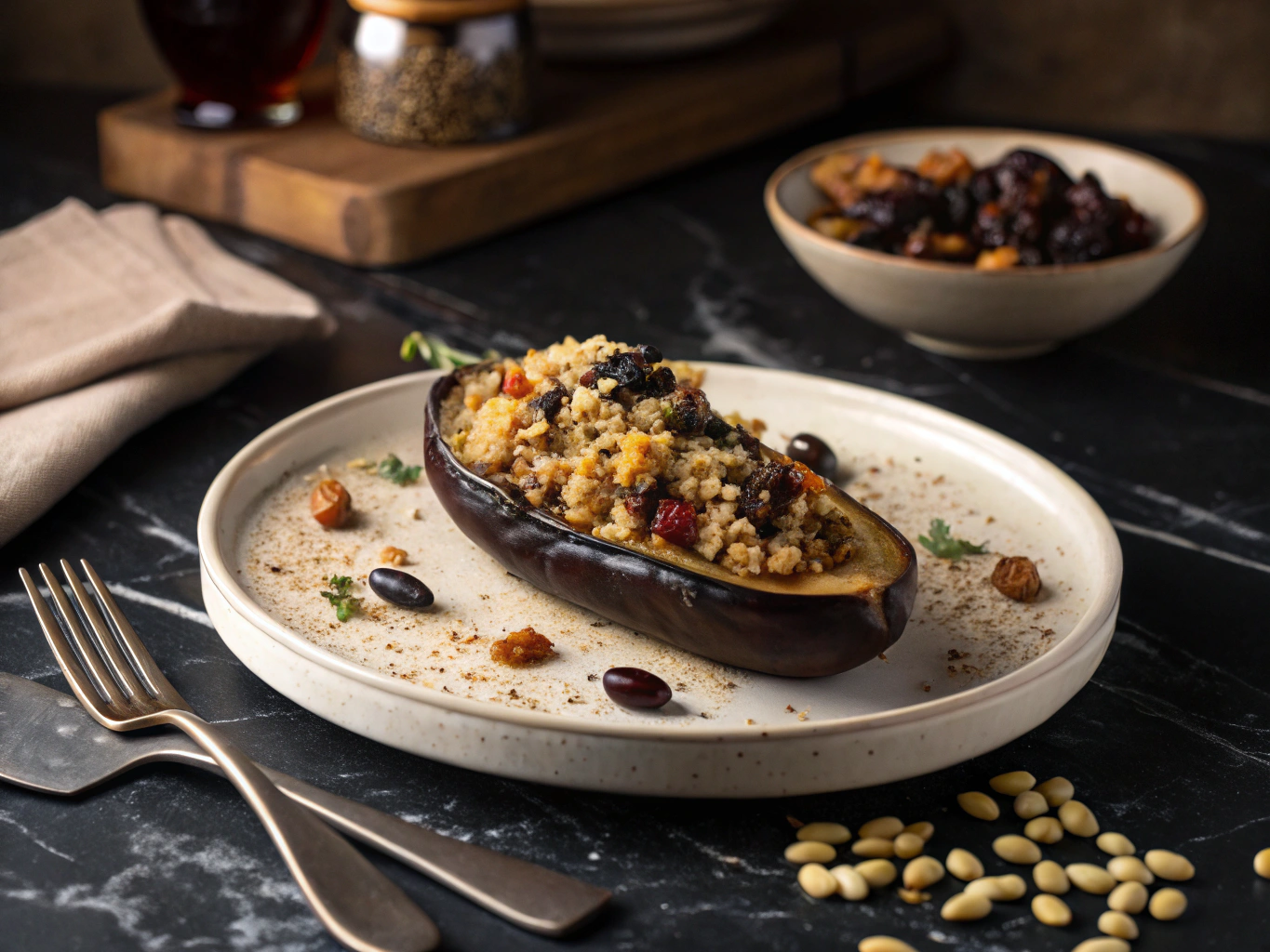 A Mediterranean delight: tender eggplants filled with fluffy quinoa, sweet raisins, and crunchy pine nuts.