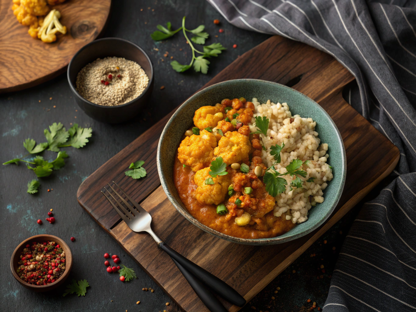 A deeply comforting and vibrant curry that transforms simple ingredients into a creamy, satisfying meal. The red lentils melt into a rich sauce, perfectly embracing the tender cauliflower florets. Cocinar es cuidarte.