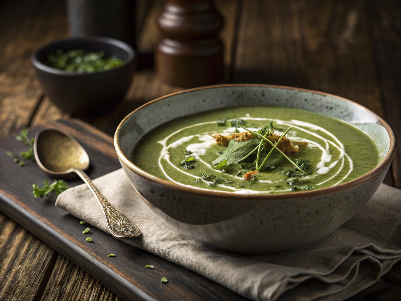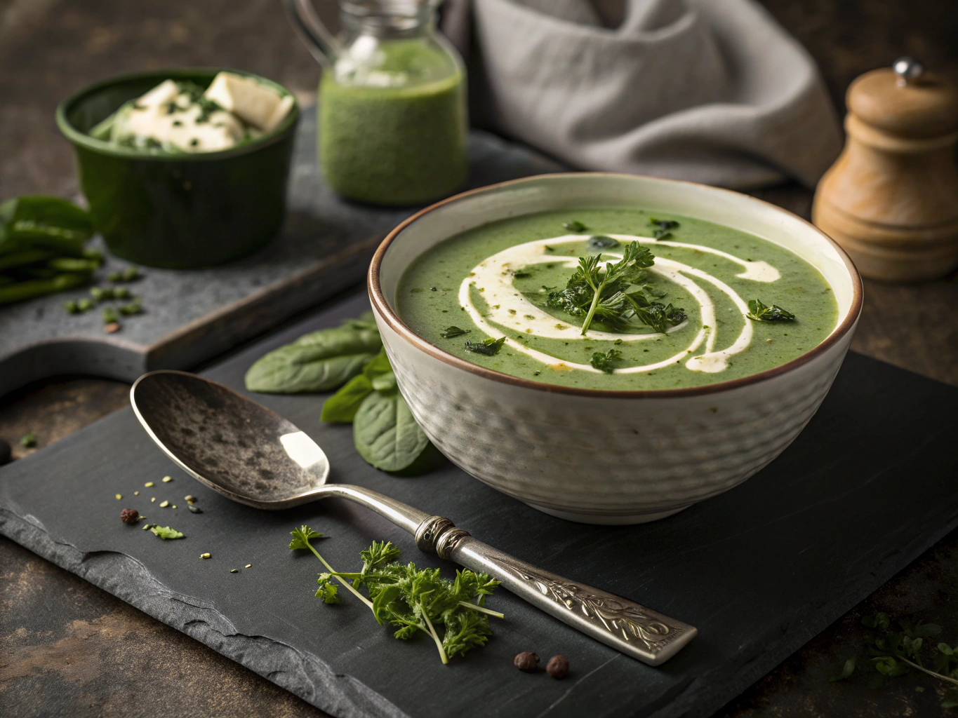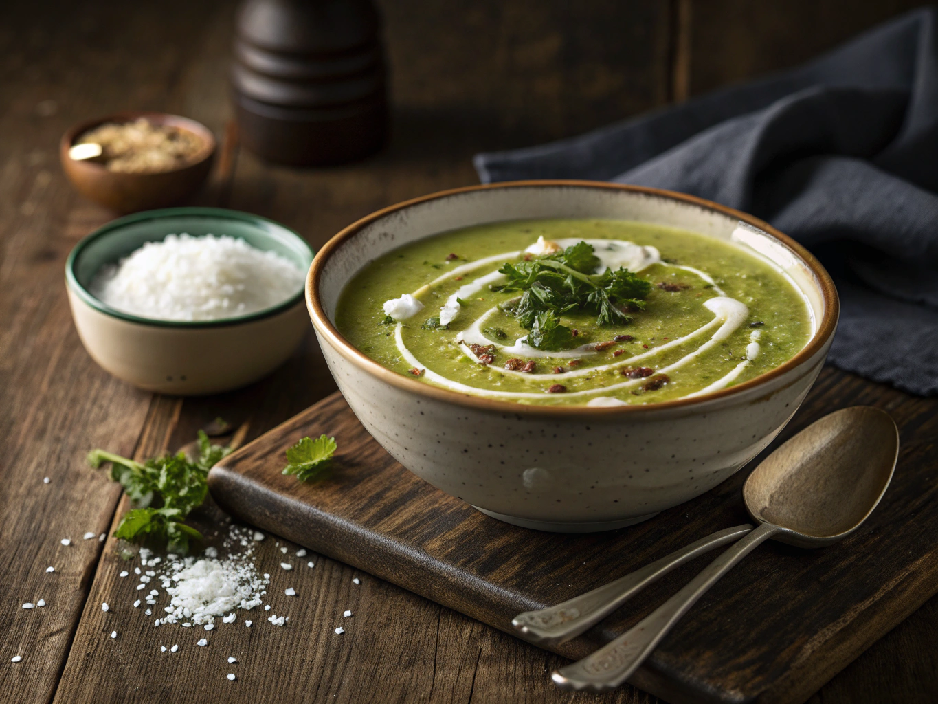 A vibrant, velvety soup that transforms simple greens into a nourishing and deeply satisfying meal, finished with a tangy swirl of Greek yogurt and the hidden creaminess of cashews.