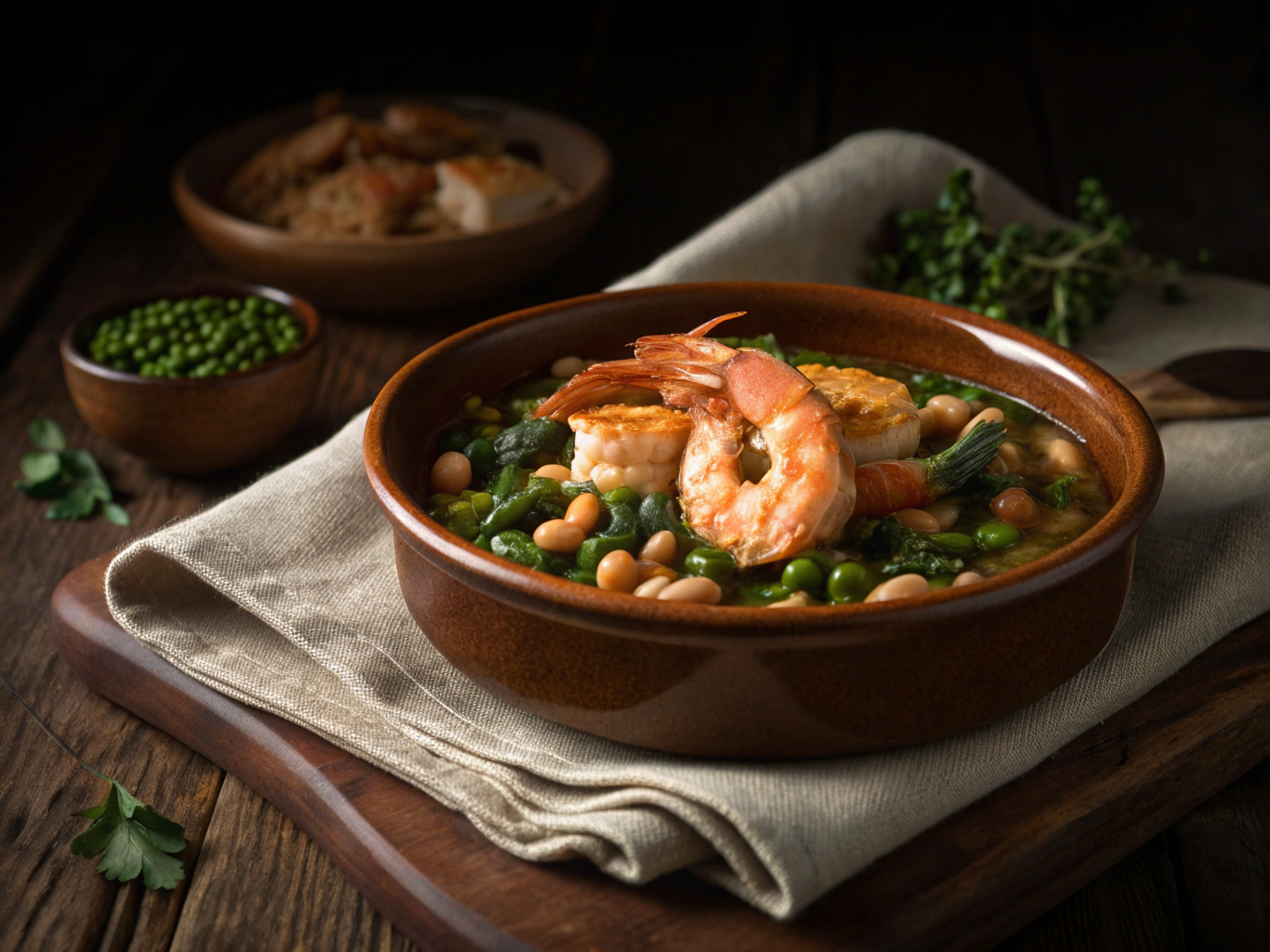 This exquisite combination of delicate Asturian verdinas beans and succulent grilled king prawns represents the perfect marriage between land and sea. A dish that transforms humble ingredients into an elegant celebration of Spanish coastal cuisine.